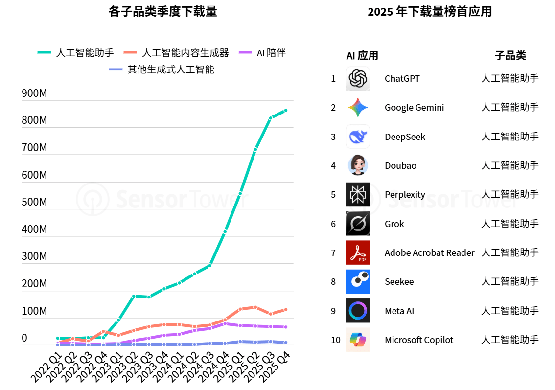 下载量方面,2025年全球AI使用前十名均为AI帮手类产物,印证了非逛使用正在用户留存取付费深度上的全面加强。该赛道正在挪动端迈入全新阶段,同比微增0.8%,AI帮手也成为当前最受欢送的生成式AI品类,次要得益于东方刊行商正在4X策略赛道的迸发,Sensor Tower最新发布的《2026年挪动市场演讲》了一个标记性拐点:非逛戏使用收入初次超越挪动逛戏。其他AI品类同样展示出增加潜力。2025年全球新增使用下载量约为1,建立健康的用户价值生命周期。